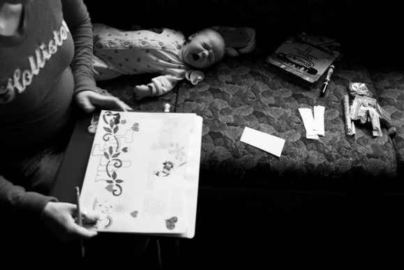 A client at the Rural Women's Recovery Program in Athens, Ohio, draws on a piece of paper, while, her baby cries on the sofa at the Program.